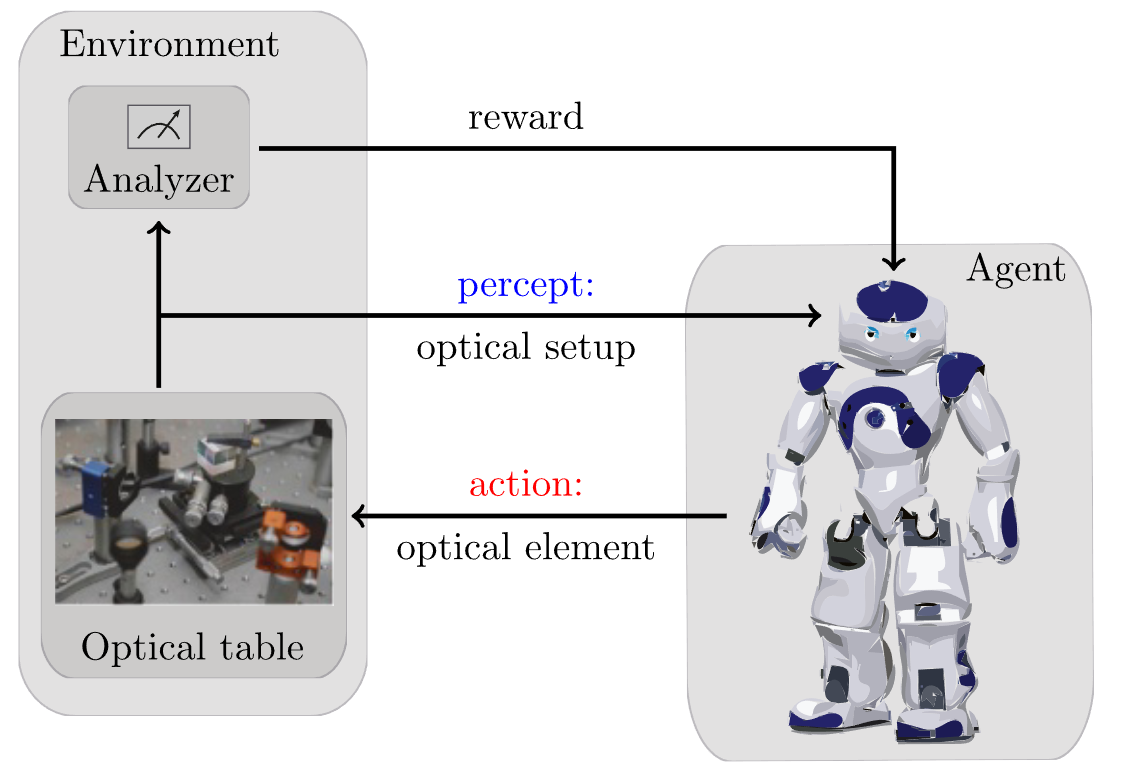 As you may already guess, RL has a lot of applications in Physics. For instance, an agent can learn to place different optical devices (its actions) into a quantum optical table to reach a certain quantum state!