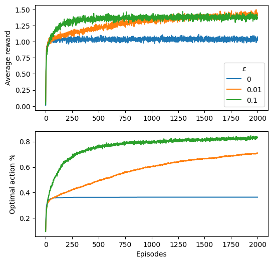 Let’s put the previous in practice! Here is a function implementing a multi-armed bandit environment. Complete the code to create an agent that uses the \(\epsilon\)-greedy policy to interact with the environment and learn the value function \(Q(a)\) for each action. Train your agent over \(2000\) episodes with three different epsilon values: [0, 0.01, 0.1]. Plot a time average of the reward over time for each epsilon value to see how exploration affects learning.