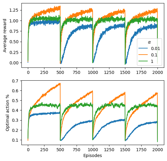 We often want to consider non-stationary problems, where the value of each action may change over time. In this case, we can use a constant step-size parameter \(\alpha\) to update our value function: \[\begin{equation} Q_{t+1}(a) = Q_t(a) + \alpha (R_t(a) - Q_t(a)), \end{equation}\] where the factor \(\alpha\) determines how fast we want to adapt to changes in the environment: if \(\alpha\) is small, updates are conservative and rely heavily on past estimates. On the other hand, if \(\alpha\) is large (close to 1), the estimate rapidly adapts to the most recent reward.