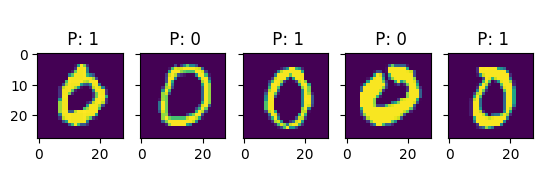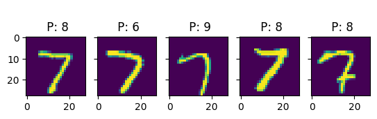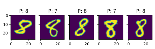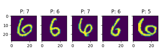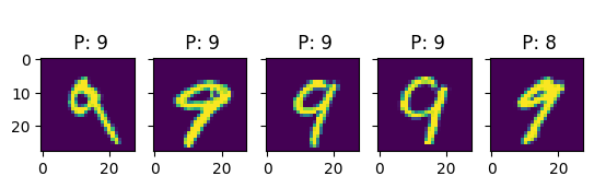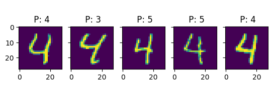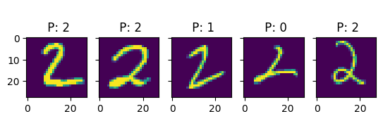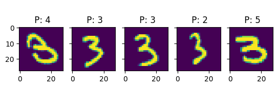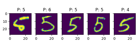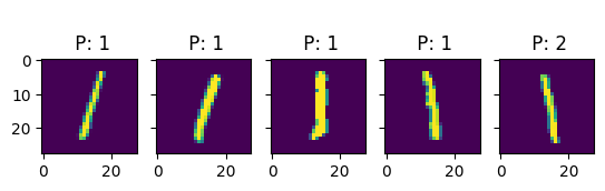 k =5for i inrange(10): idx = np.where(true_test == i)[0] # find indices of i-digit fig, ax = plt.subplots(1, k, sharey=True)for j inrange(k): title_string ="\n P: "+"{:01d}".format(pred_test[idx[j]])) ax[j].set_title(title_string) ax[j].imshow(X_test[idx[j], :].reshape(28, 28))# plt.show()