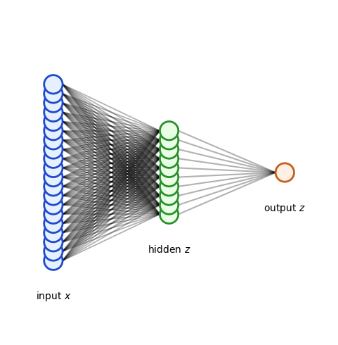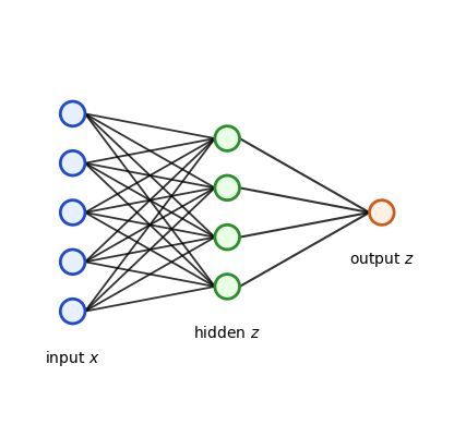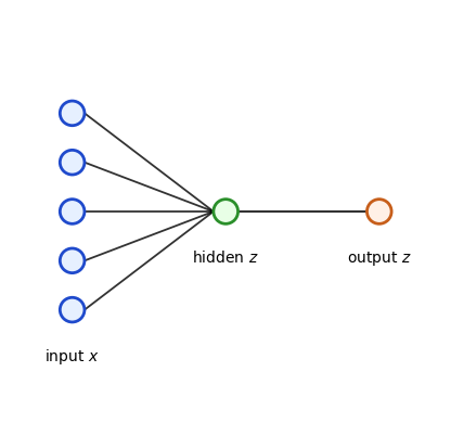 import matplotlib.pyplot as pltfrom matplotlib.patches import Circledef plot_nn(V=5, H=1, r=0.12, spacing =4, figsize = (6,4), alpha =0.8): fig, ax = plt.subplots(figsize=figsize) ax.set_aspect('equal') ax.axis('off')# x positions for layers xs = {'visible': 0.0, 'hidden': 1.5, 'output': 3.0}# vertical spacing scales with radius spacing = spacing * r# y positions depend on radius and number of neurons y_vis = [(i - (V-1)/2) * spacing for i inrange(V)] y_hid = [(i - (H-1)/2) * spacing for i inrange(H)] y_out = [0.0]# Draw nodesdef draw_nodes(x, ys, face, edge):for y in ys: ax.add_patch(Circle((x, y), r, facecolor=face, edgecolor=edge, lw=2))# ax.text(x, max(ys)+0.6, ha='center', va='bottom', fontsize=12, weight='bold') draw_nodes(xs['visible'], y_vis, face='#e6f0ff', edge='#1f4acc') draw_nodes(xs['hidden'], y_hid, face='#e8ffe6', edge='#2a8f2a') draw_nodes(xs['output'], y_out, face='#fff0e6', edge='#c75e1a')# Connectionsfor y1 in y_vis:for y2 in y_hid: ax.plot([xs['visible']+r, xs['hidden']-r], [y1, y2], lw=1.3, alpha=alpha, c ='k', zorder =-1)for y2 in y_hid: ax.plot([xs['hidden']+r, xs['output']-r], [y2, y_out[0]], lw=1.5, alpha=alpha, c ='k', zorder =-1) ax.text(xs['visible'], min(y_vis)-0.5, r'input $x$', ha='center', fontsize=10) ax.text(xs['hidden'], min(y_hid)-0.5, r'hidden $z$', ha='center', fontsize=10) ax.text(xs['output'], -0.5, r'output $z$', ha='center', fontsize=10) ax.set_xlim(-0.6, 3.6) ax.set_ylim(min(y_vis[0], y_hid[0])-1, max(y_vis[-1], y_hid[-1])+1) plt.tight_layout() plt.show()plot_nn(V=5)