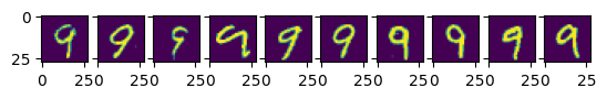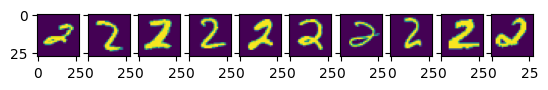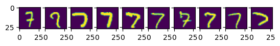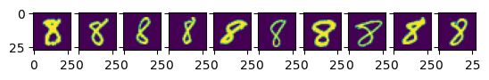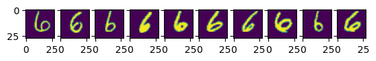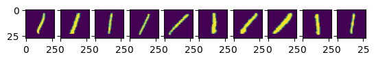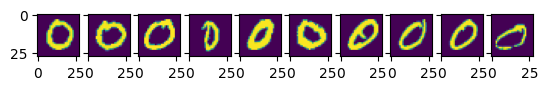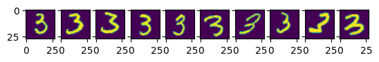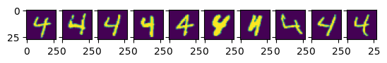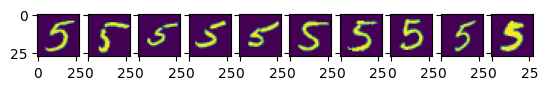 k =10for i inrange(0,10): idx = np.where(y_train == i)[0] # find indices of i-digit fig, ax = plt.subplots(1, k, sharey=True)for j inrange(0, k): ax[j].imshow(x_train[idx[j]]) plt.show()