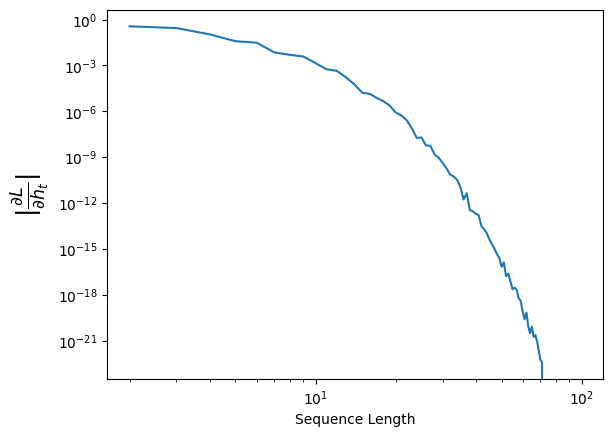 torch.manual_seed(0)device ='cuda'if torch.cuda.is_available() else'cpu'# This line will select cpu is cuda is not available!# We define a simple RNN as abocernn = nn.RNN(input_size =1, hidden_size =5, batch_first=True, nonlinearity='tanh').to(device)# Let's consider input lengths from 2 to 100seq_lengths = torch.arange(2,100).to(int)gradients_Whh = []for L in tqdm(seq_lengths):# We just define a dummy input, we don't care too much on its value# because it does not enter in the gradient calculation (see equation# above). x = torch.zeros(1, L, input_size, device = device)# We initialize a random gaussian hidden state h0 = torch.randn(1, 1, hidden_size, requires_grad=True, device = device) out, hn = rnn(x, h0) # Simple MSE loss depending only on the last output last_out = out[:, -1, :] loss = (last_out - torch.rand_like(last_out)).pow(2).sum()# Backprop rnn.zero_grad()if h0.grad isnotNone: h0.grad.zero_() loss.backward() gradients_Whh.append(h0.grad.norm().item())