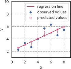 Having a model, we now have to define a loss function for our regression task. For this case, we choose the mean square error, defined as \[MSE=\frac{1}{N}\sum_{i=1}^{N}(y_i'-y_i)^2.\] Such a loss measures the mean vertical distance between the dataset and the line \(y'=w_1 x + w_0\) (see Figure 2).